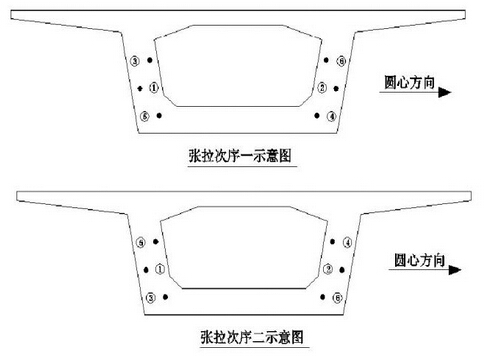 同截面張拉順序問題:先要根據(jù)施工方法相應(yīng)的受力要求確定。對于可同工況張拉的同類型鋼束(例如都是短束、或都是長束),應(yīng)遵循對稱,由內(nèi)向外的原則。例如先張拉腹板束,再張拉頂?shù)装?。其?shí)對于直線橋,截面張拉順序?qū)?yīng)力影響不大,可靈活調(diào)整。但是對于彎橋,研究證明,遵循對稱張拉的大前提下,宜先張拉外側(cè)腹板束,再張拉內(nèi)側(cè)腹板束。原因是外側(cè)鋼束會(huì)使曲率降低而內(nèi)側(cè)鋼束則會(huì)增大曲率,即“外側(cè)安內(nèi)側(cè)危險(xiǎn)”。如下圖所示。